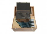 В наборе может быть от 2-х до 12 приборов механического или цифрового типа. Инструменты упакованы в пластиковый или деревянный футляр, снабжены установочными мерами, а также паспортом изделия. Материал исполнения – закаленная сталь, измерительные поверхности покрыты твердосплавным материалом, скоба инструмента снабжена теплоизолирующими накладками.