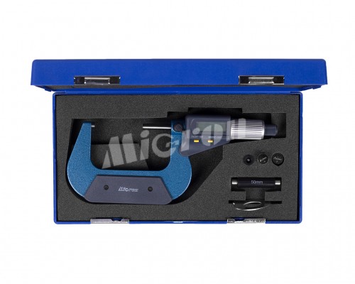 Гладкий цифровой микрометр предназначен для измерений внешних размеров детали, а также для поверки менее точной техники. Прибор применяется в машиностроении, приборостроении и других отраслях промышленности. Прибор состоит из скобы, подвижного стержня, неподвижной пятки, микрометрической головки — отсчетное устройство, основанное на применении винтовой пары, которая преобразует вращательное движение микровинта в поступательное движение подвижной измерительной пятки и электронный блок с органами управления. Цифровой гладкий микрометр позволяет быстрее и легче считывать показания, а также устанавливать прибор на «нуль», менять систему вычислений с метрической на дюймовую, устанавливать пределы допуска и др. функции.Инструмент оснащен теплоизоляционными накладками, исключающими влияние тепла рук на результаты измерений. Каждый прибор упакован в жесткий пластиковый или деревянный футляр и имеет паспорт изделия, в котором прописаны все необходимые характеристики и нормы эксплуатации. В комплекте к микрометру идет установочная мера, за исключением моделей с верхним пределом измерений 25 мм.