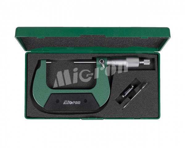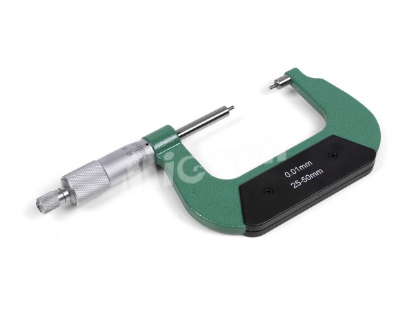 Микрометр с малыми измерительными поверхностями типа МК-МП предназначен для измерения пазов и шлицев, шпоночных канавок и других, труднодоступных для измерения мест, контролируемых изделий. Особенно подходят для измерения мелких деталей благодаря размерам измерительных поверхностей, диаметр которых составляет от 2-х до 3-х мм. Прибор состоит из скобы, в которую с одной стороны запрессована пятка, а с другой – стебель с микрогайкой. К стеблю фиксируется барабан и корпус трещотки. Для сближения пятки с винтом, вращают трещетку. Отсчет показаний производится по шкалам стебля и барабана с нониусом. Предел допускаемой погрешности микрометра с пределом измерений 0-25 и 25-50 мм составляет ±2.0 мкм, с пределом измерений 50-75 и 75-100 - ±2.5 мкм.Микрометр выполнен из высококачественной закаленной стали, измерительные поверхности покрыты твердосплавным материалом, скоба оснащена теплоизоляционными накладками. Прибор поставляется в жестком пластиковом или деревянном футляре, обеспечивающем безопасное хранение инструмента.
